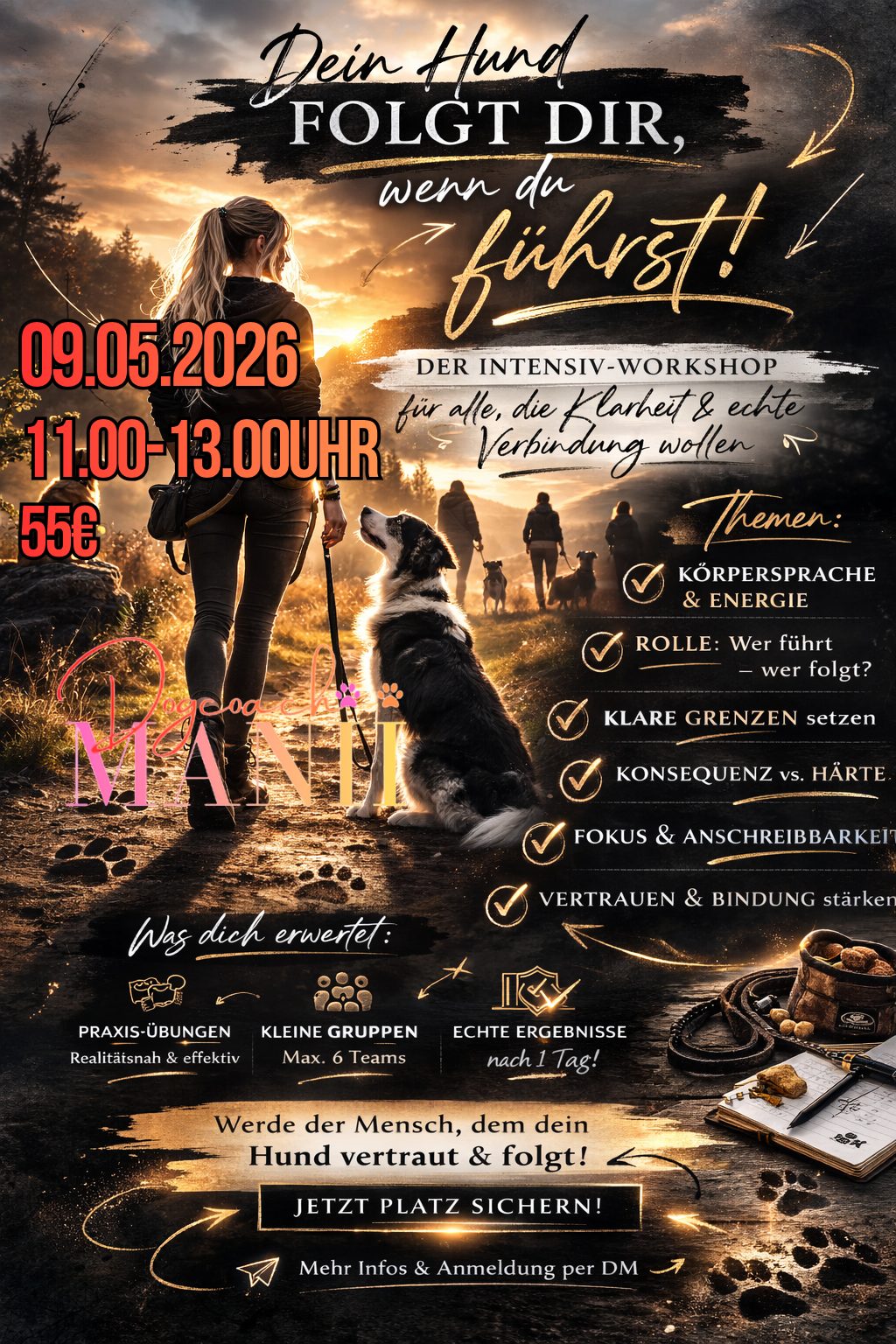 Du lernst die Grundlagen von klarer Führung damit dein Hund versteht dir zu folgen und nicht nur weil es belohnung dafür gibt. Es geht nicht um blindes Gehorchen, sondern um echte Orientierung: Dein Hund folgt dir, weil du führst – ruhig, fair und verständlich.