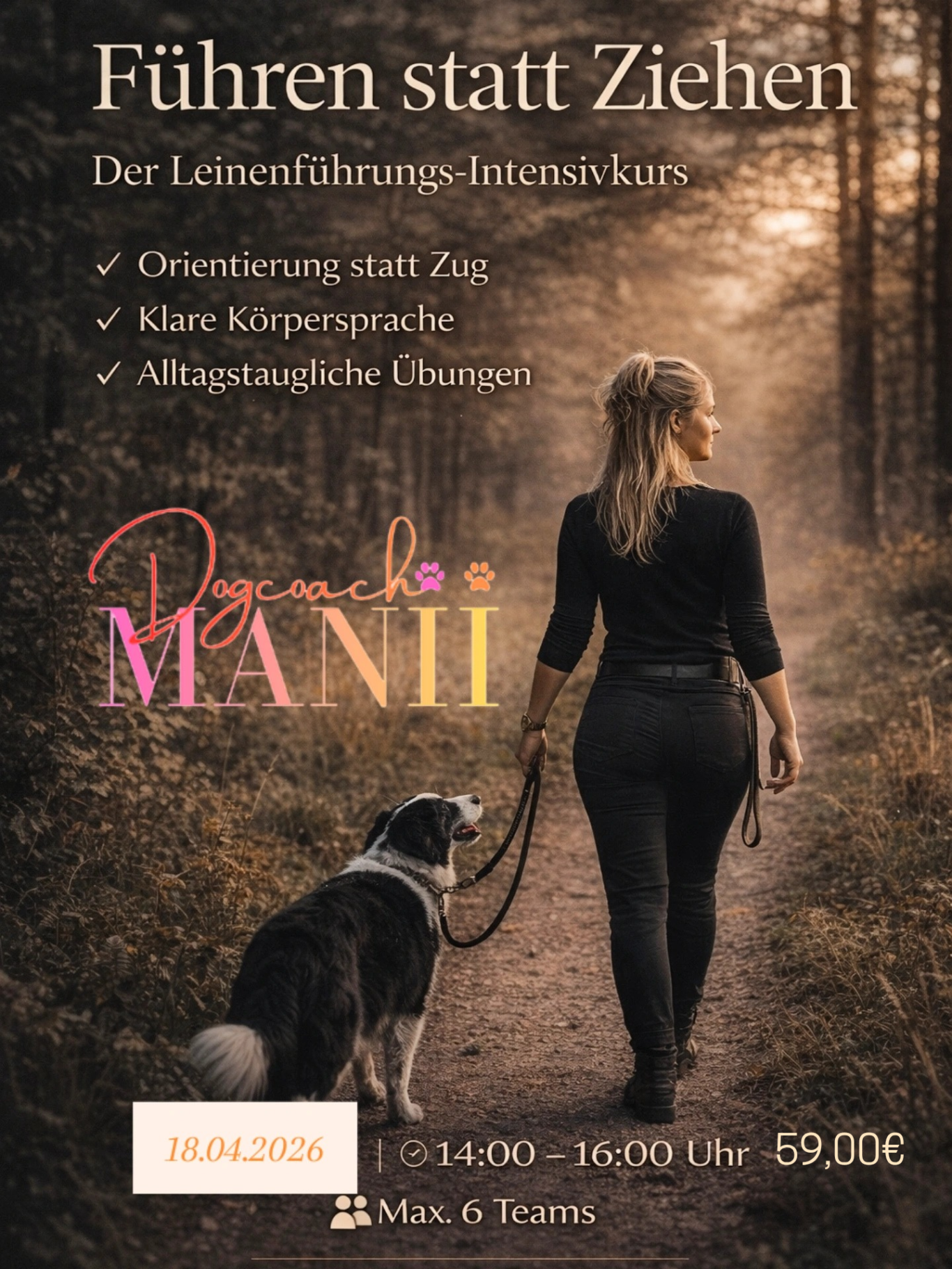 Ein Spaziergang an der Leine kann stessfrei sein :dein Hund läuft entspannt an der Leine, bleibt aufmerksam bei dir und zieht nicht mehr. Genau das trainieren wir im Leinenführung Intensiv-Kurs: ein praxisnahes Training, bei dem dein Hund lernt, souverän an lockerer Leine zu laufen, und du Sicherheit und Orientierung gibst.