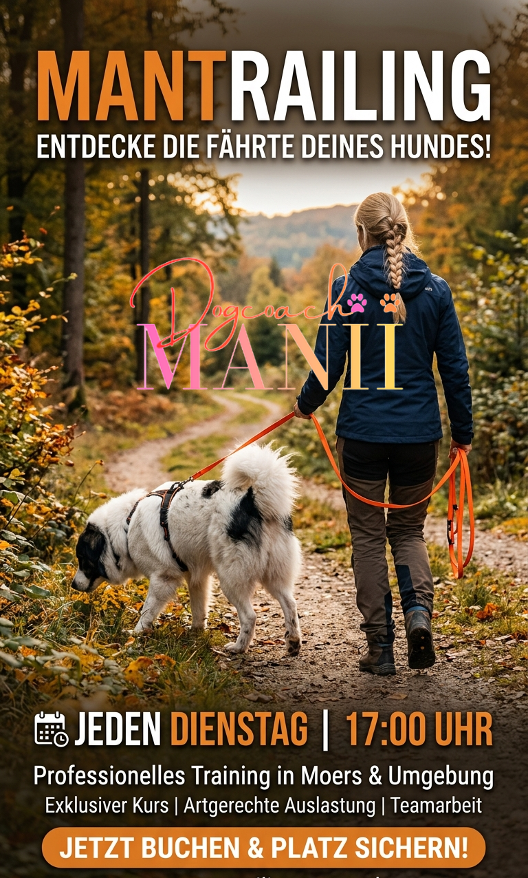 Mantrailing ist mehr als nur Spurensuche: Dein Hund arbeitet konzentriert an einer individuellen Geruchsspur und nutzt dabei seine natürlichen Fähigkeiten.Dein Hund führt, trifft Entscheidungen und zeigt dir den Weg. Genau darin liegt der besondere Wert dieser Arbeit.Du lernst, ihn richtig zu lesen, zu begleiten und ihm zu vertrauen – so entsteht echte Teamarbeit