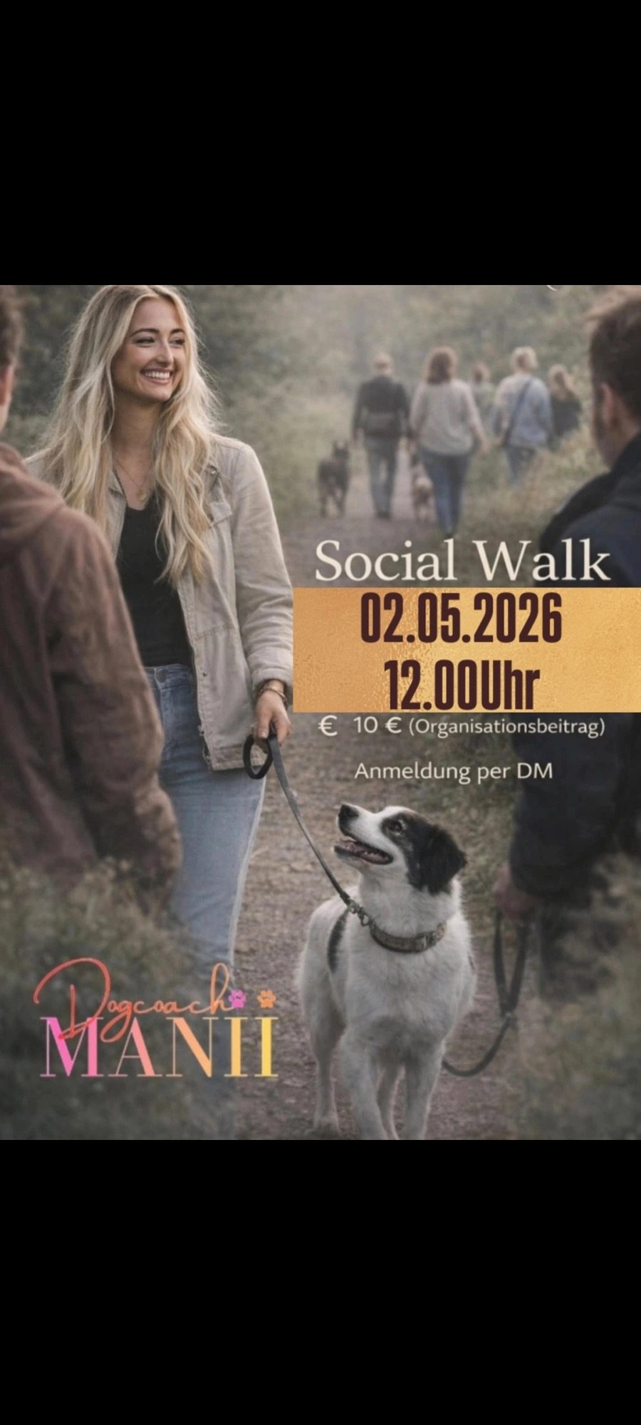 Der Social Walk ist eine lockere Gelegenheit, gemeinsam draußen unterwegs zu sein. Anders als die Kurse findet das Event nur einmal im Monat statt – ideal, um neue Eindrücke zu sammeln, andere Hundeteams zu treffen und den Hund an verschiedene Reize zu gewöhnen.