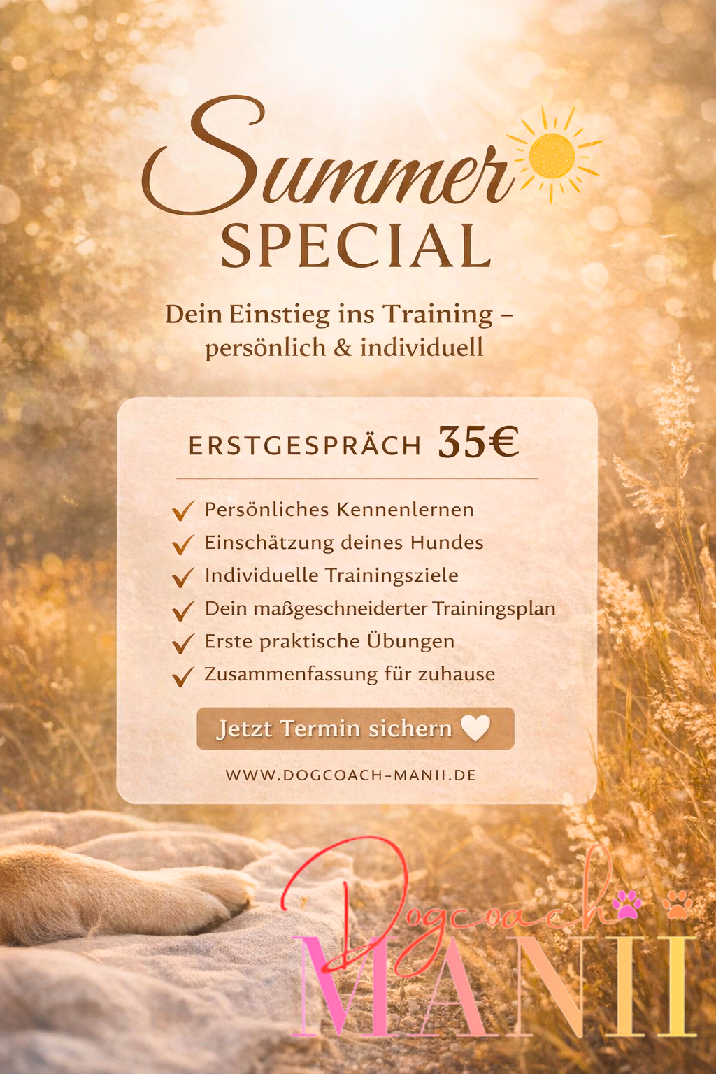 🐾 Buche jetzt dein Summer Special für 35 € und genieße entspanntes Training mit deinem Hund!